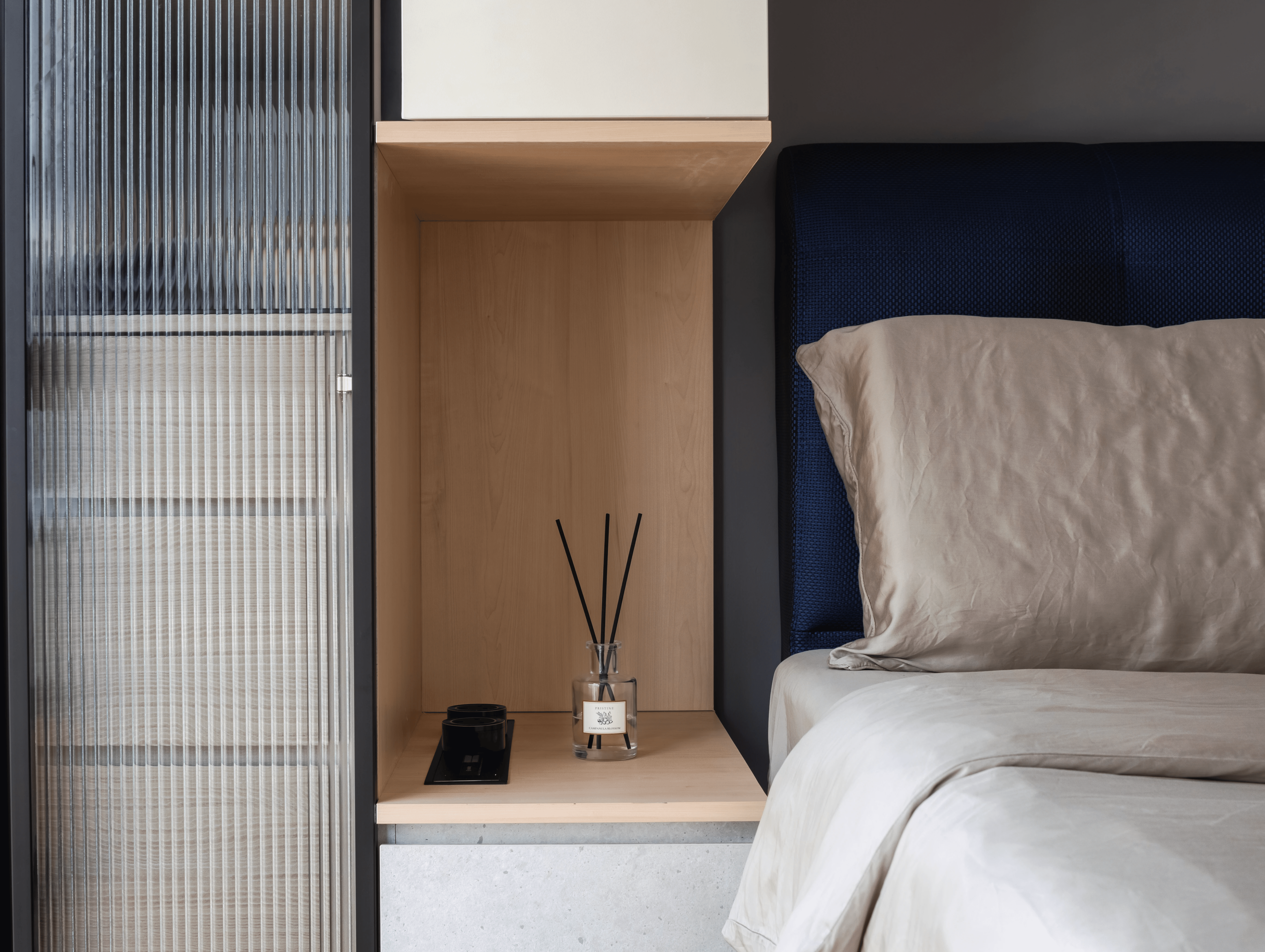The dining area features a fluted glass cabinet with ambient lighting, combining both visual warmth and storage function.