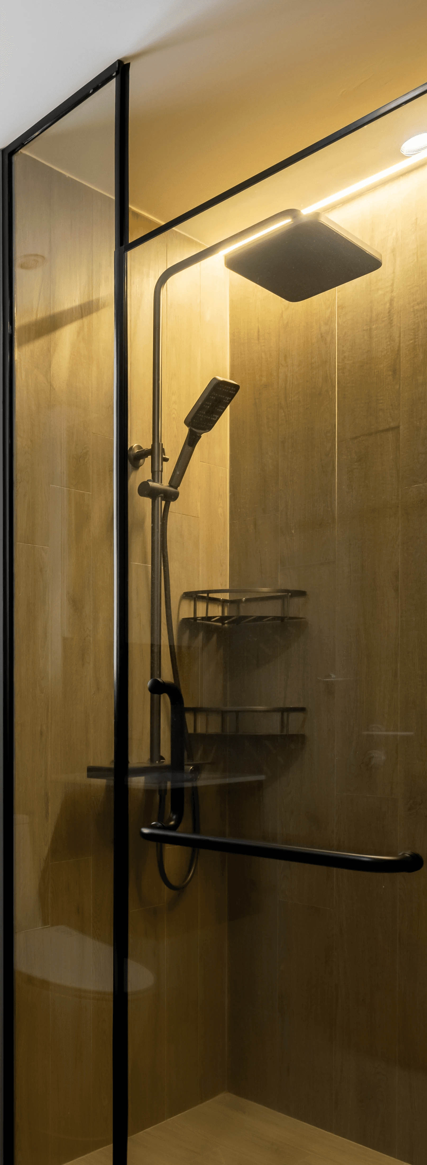 One bath embraces warmth with wood-accent tiles and a glass enclosure, while the other feels airy and bright with soft grey-beige tones and vertical detailing.