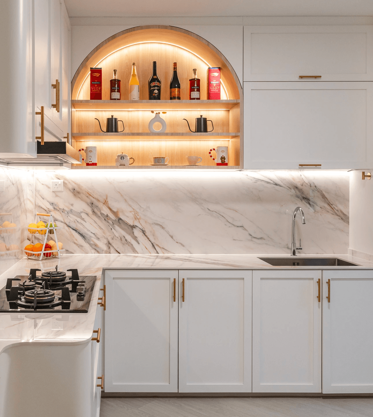 A softly lit arch in the kitchen provides a curated stage for drinks, mugs, and decorative items, adding a touch of personality to a clean, functional layout.