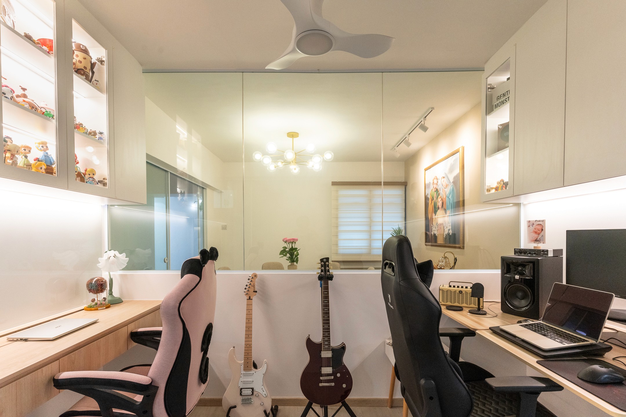 A transparent divider allows natural light to flow between the dining and study areas while maintaining privacy for focused work.