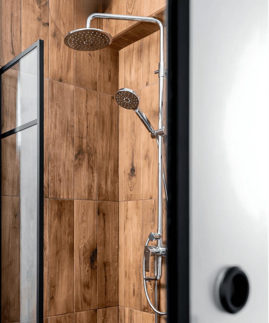 Exposed black piping, monochrome patterned tiles, and wood-grain finishes create a functional yet expressive design.