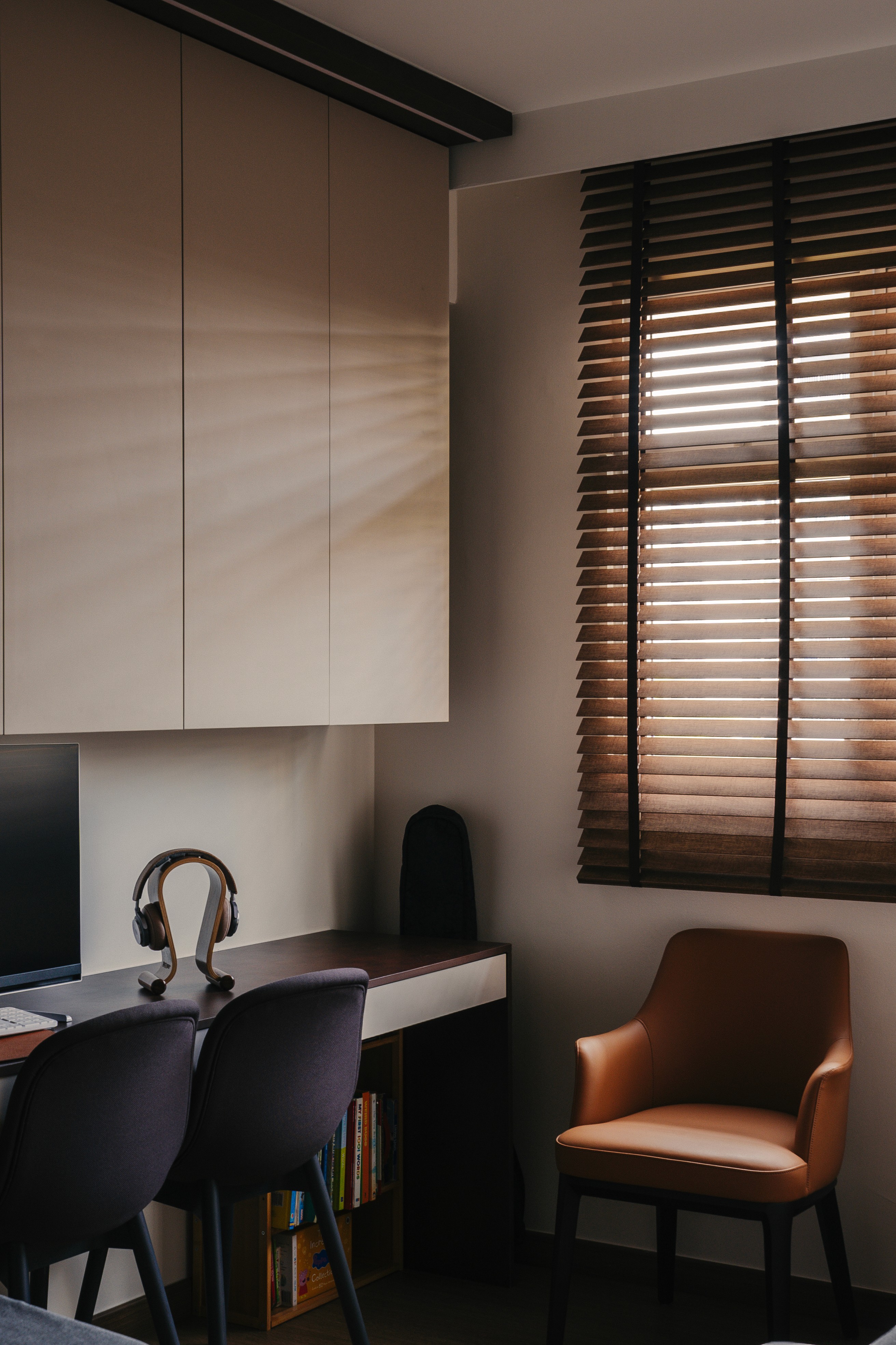 A built-in display with bronze-backed shelves anchors the space. It layers intimacy and elegance, offering curated glimpses of keepsakes while housing ample concealed storage.