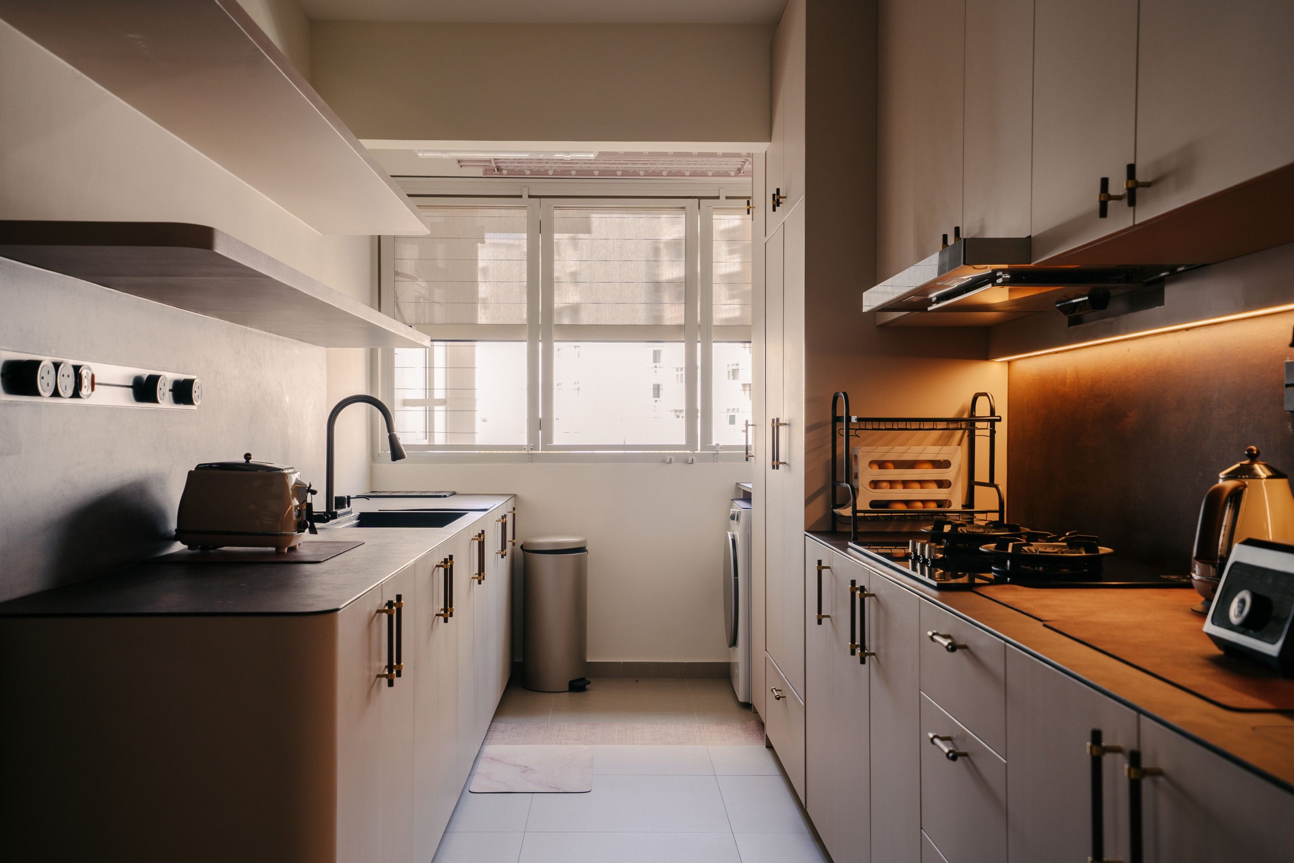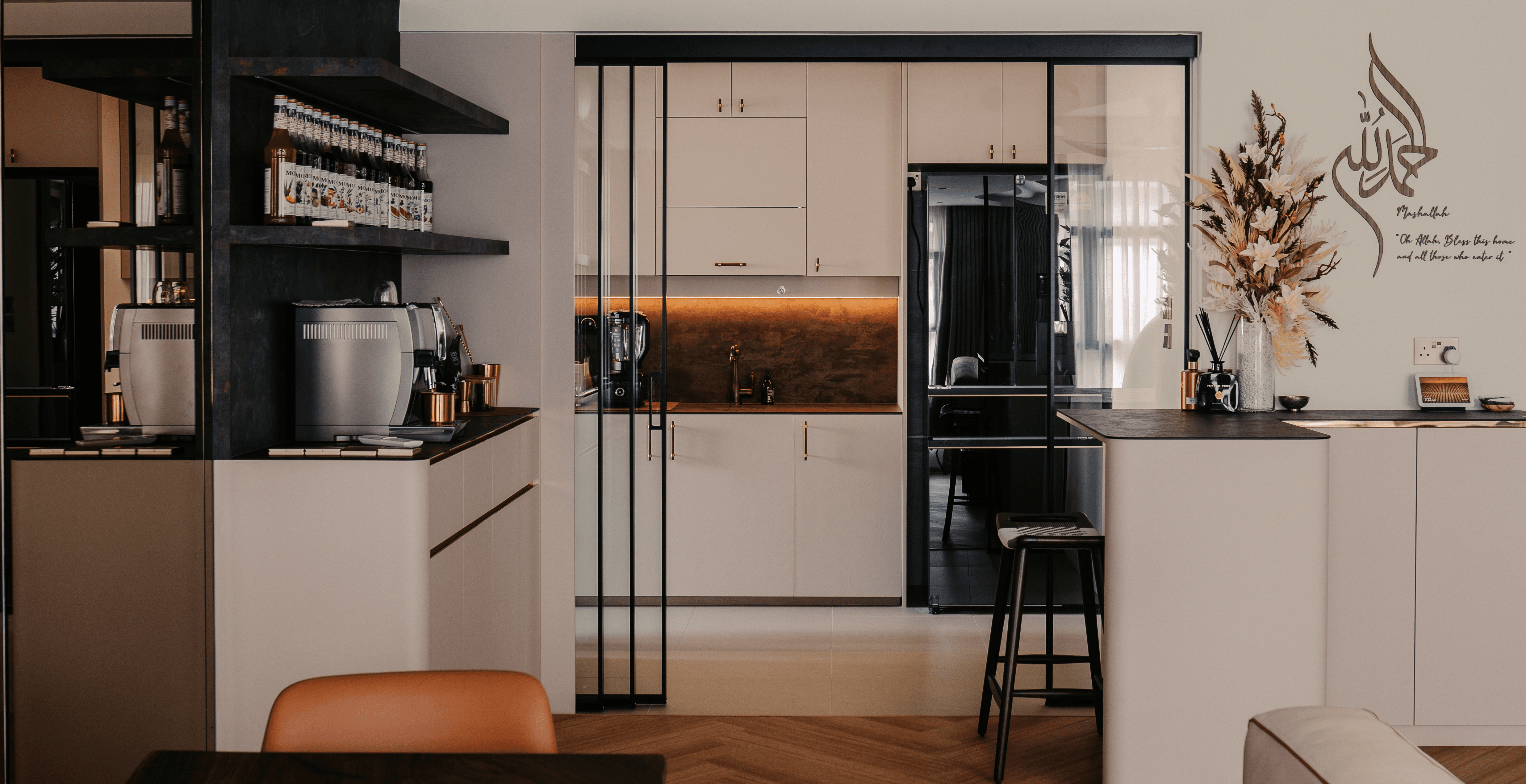A palette of soft latte tones, warm taupes, and ivory is grounded by matte black and deep bronze detailing. Chevron timber flooring introduces quiet rhythm underfoot.