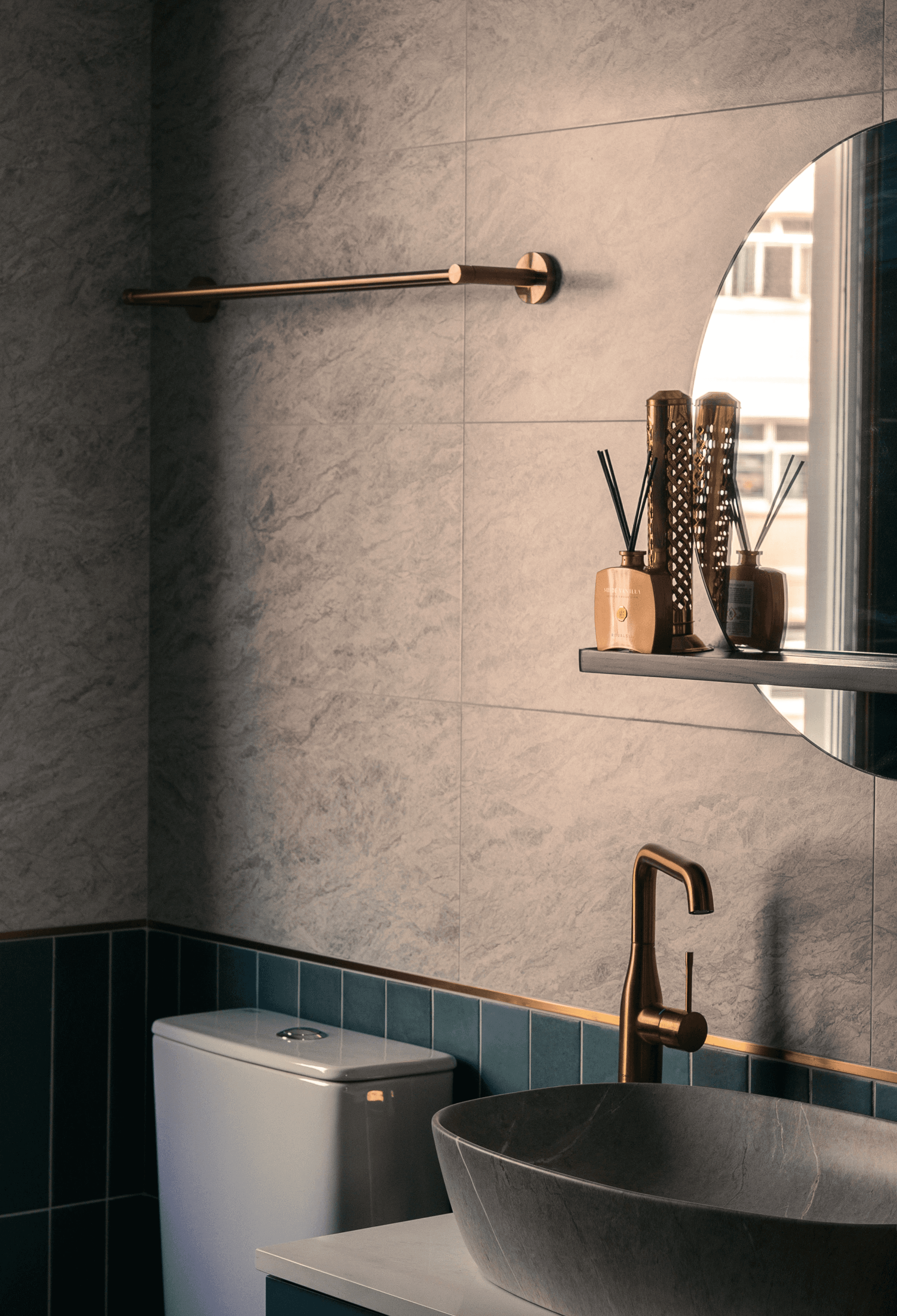 Thoughtfully recessed with ambient LED trimming, the arched mirror and upholstered bench offer a reflective pause at the home’s threshold—merging function with emotional gesture.
